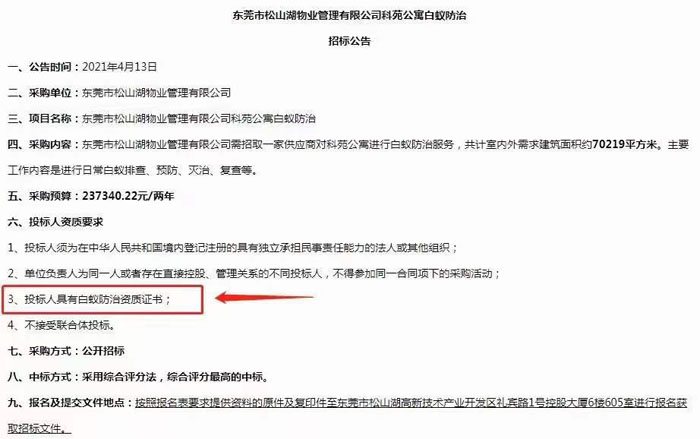 物業(yè)管理公司公寓白蚊防治招標(biāo)要求有白蟻防治資質(zhì)