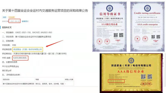一、項目編號:GWZC-2021-150、XACHZC-XA2021-063 二、項目名稱:第十四屆全運會全運村內交通服務運營項目 三、采購結果: 中標結果: 中標 供應商名稱:躍進紫金(天津)電動車有限公司 供應商地址:天津生態(tài)城動漫中路126號動漫大廈C區(qū)一層C3區(qū)(TG第189號) 中標 金額 : 4,655,000.00元